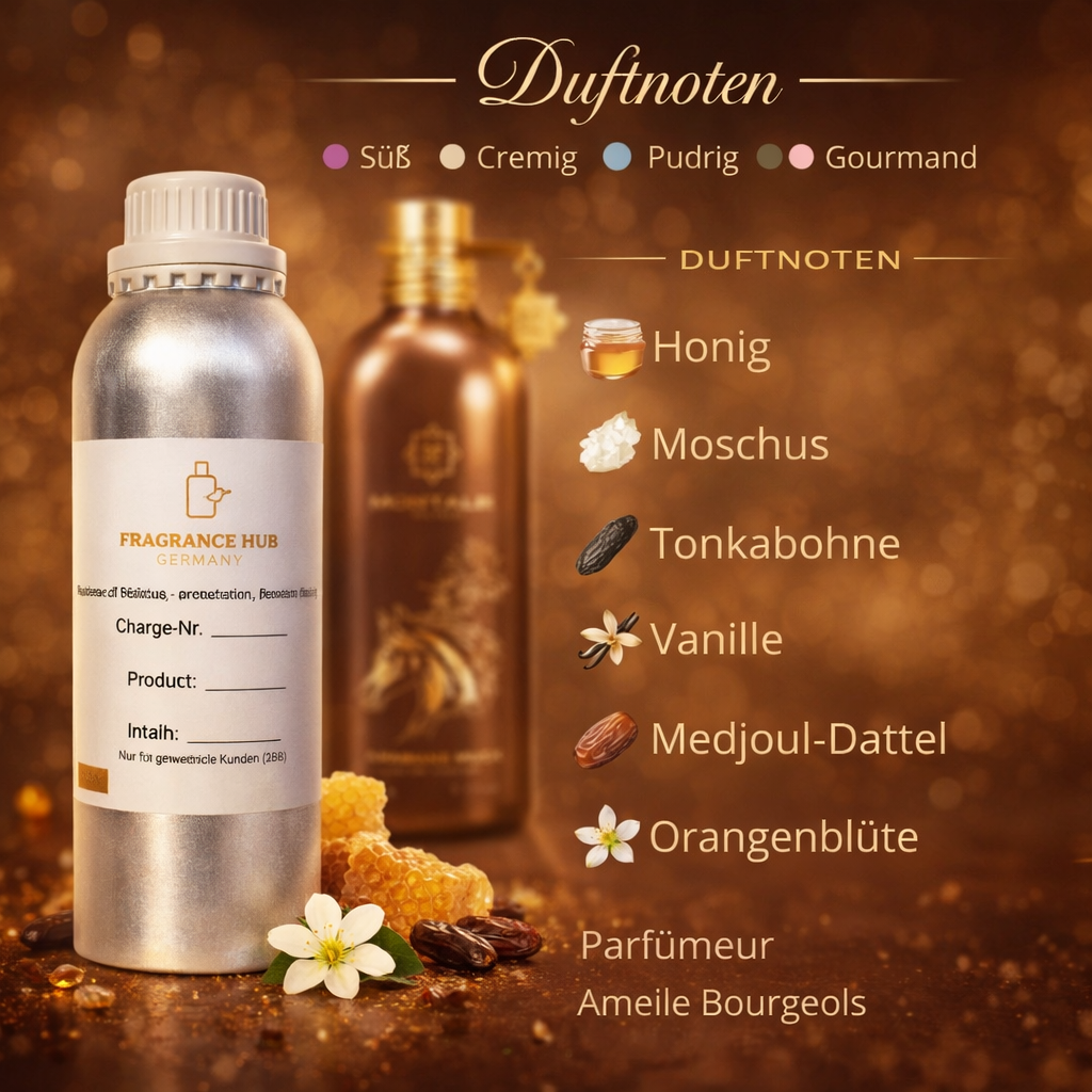 This exclusive premium perfume oil is ideally suited as a base for developing luxurious oriental fragrance creations. The balanced combination of sweet honey, sensual musk, creamy vanilla, and exotic Medjool date allows for diverse applications in professional perfumery. The outstanding reviews confirm the exceptional quality of this premium perfume oil.