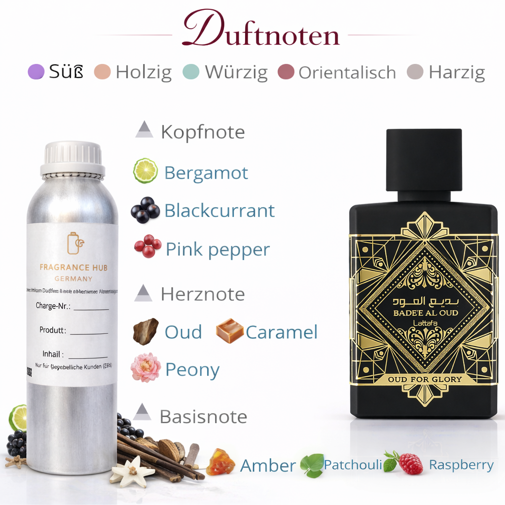 Bade'e Al Oud Oud for Glory is an exquisite premium perfume oil specially developed for use in professional perfumery. With its rich and sensual notes, it lends a unique and luxurious nuance to any perfume. This highly concentrated fragrance oil is ideal for perfumers who wish to add a touch of elegance, sophistication, and oriental depth to their creations.