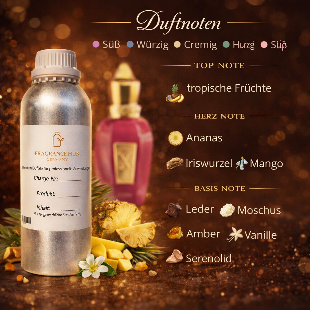 The opening captivates with vibrant tropical fruits, giving the fragrance a modern and inviting feel. At its heart, an elegant, harmonious blend of pineapple, mango, jasmine, and orris root unfolds, lending the scent a velvety, feminine depth.