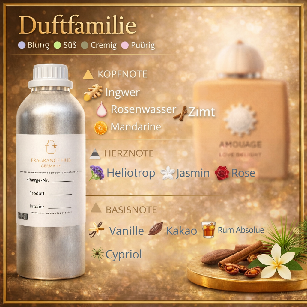 Delight is a seductive perfume oil that combines floral elegance with spicy sweetness and creamy-powdery notes. This luxurious composition with exotic spices and precious blossoms lends your perfumes a sensual and unforgettable touch.