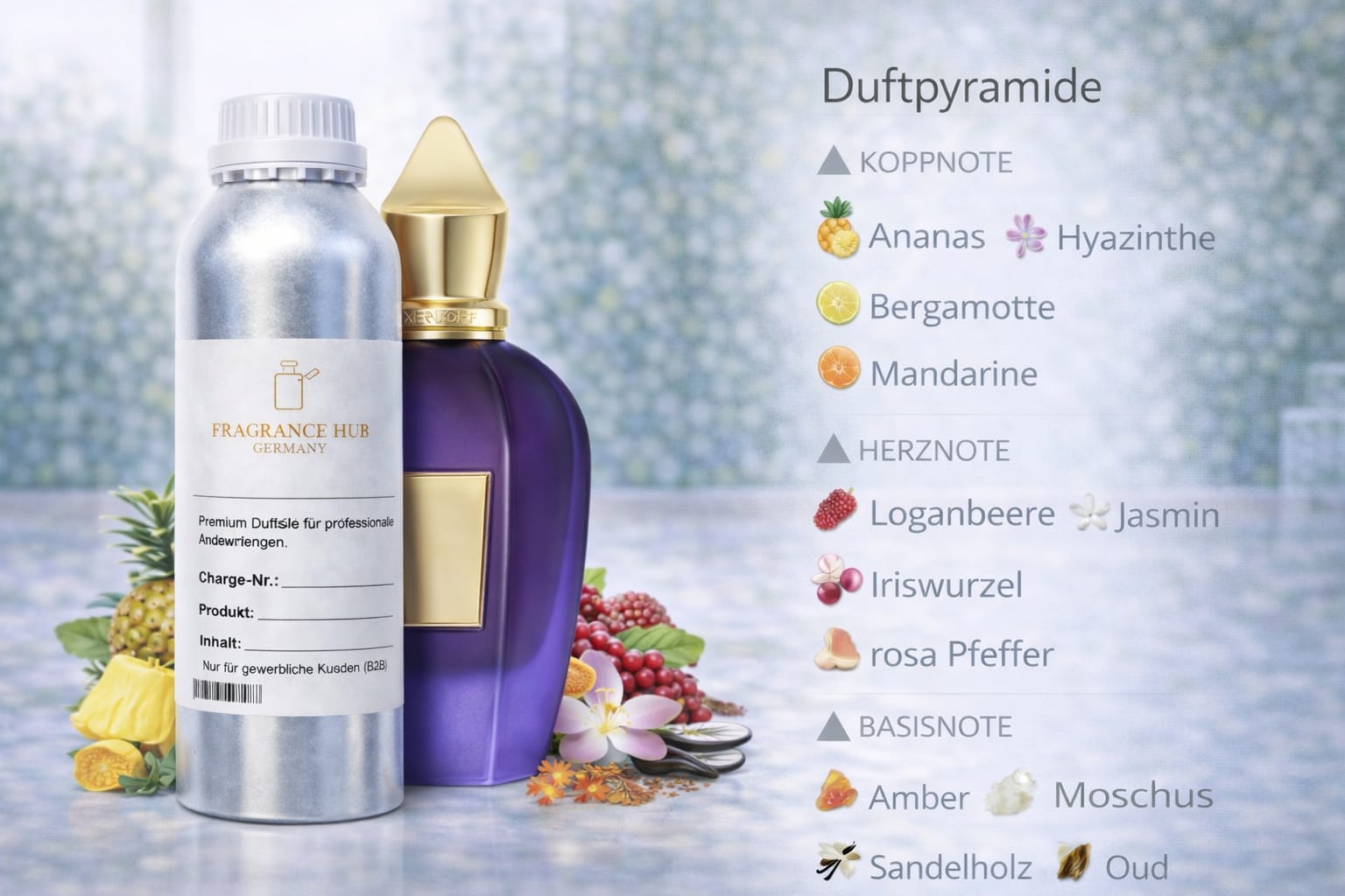FHG Purple Veil is a luxurious, fruity-floral fragrance with a sweet creaminess and elegant depth. The composition combines juicy fruit notes with delicate blossoms, powdery accents, and a warm, sensual base of amber, musk, vanilla, and oud. Developed for premium fragrance lines and professional B2B applications.