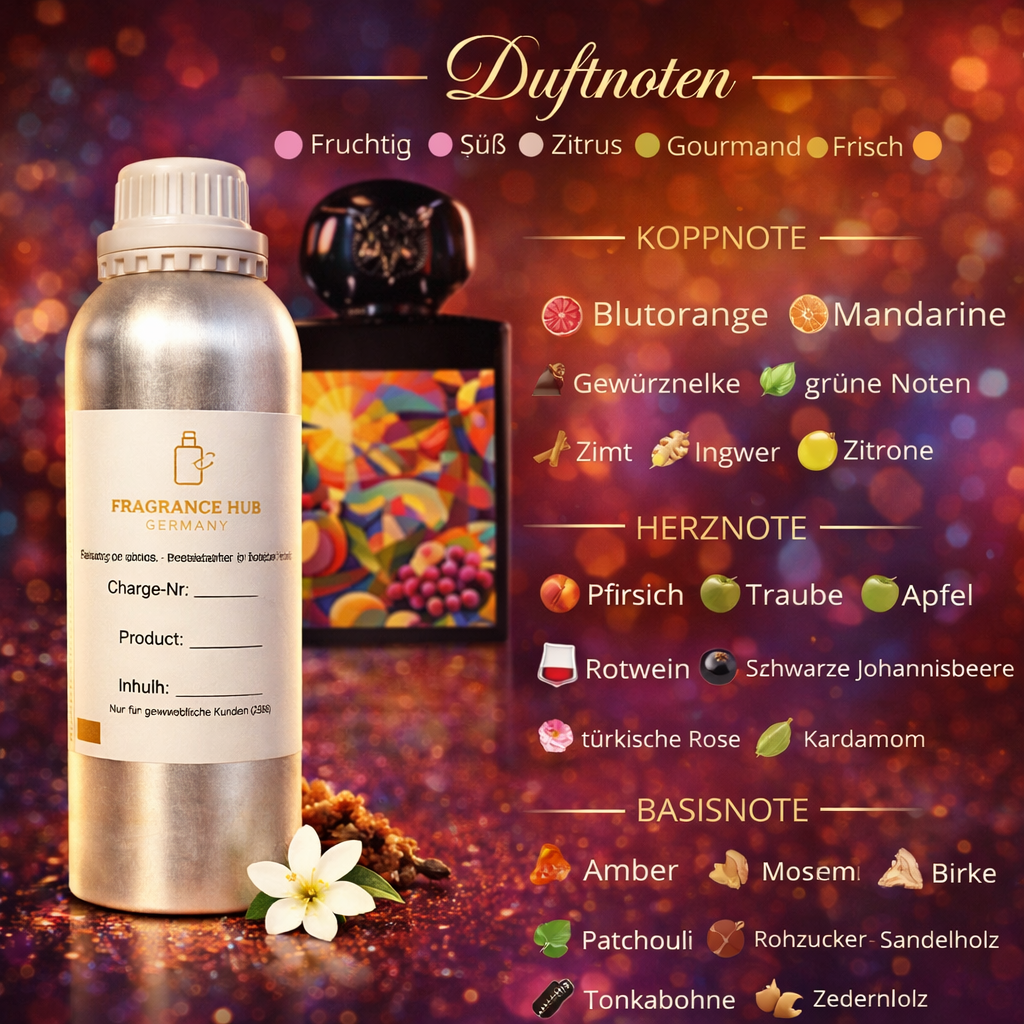 This exclusive premium perfume oil is ideally suited as a base for developing complex, luxurious fragrance creations. The exceptional combination of zesty citrus top notes, fruity heart notes with wine accents, and warm, woody-vanilla base notes allows for diverse applications in professional perfumery. Its multifaceted nature makes this perfume oil particularly valuable for exclusive niche perfumes.