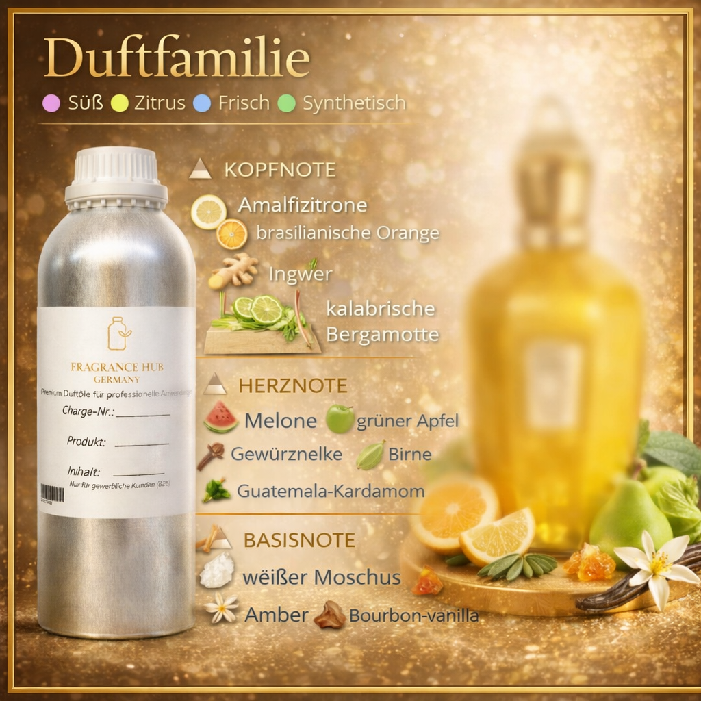 A highly concentrated premium formulation with excellent balance and high recognition value. Its exclusive quality offers a radiant, sun-kissed aura with modern freshness, elegant depth, and long-lasting effect. Appealing to a broad target audience with marketable character. Ideal for perfume production, Eau de Parfum, Eau de Toilette, private label concepts, room fragrances, cosmetic products, and high-end fragrance lines in the premium and lifestyle segments.