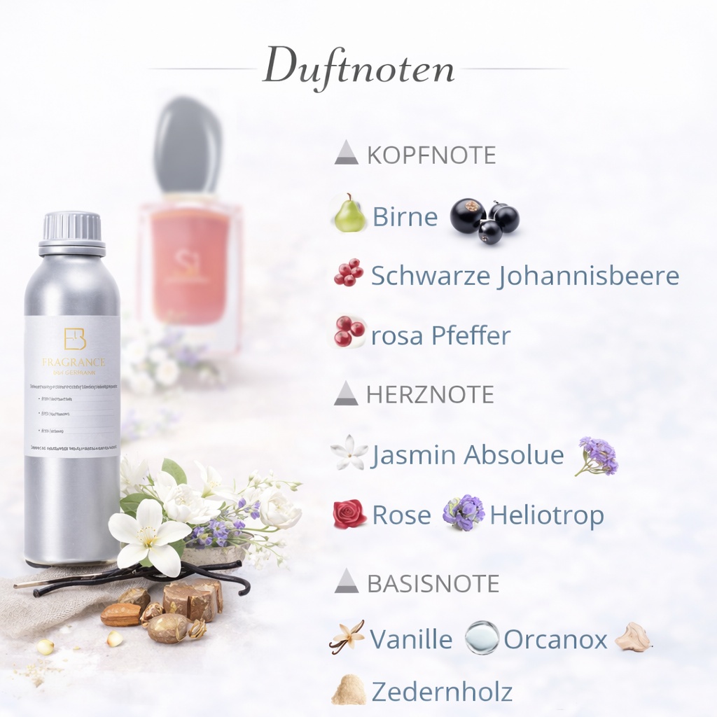 Red Si is distinguished by its long-lasting effect. Its intense fragrance creates a pleasant atmosphere and leaves a lasting impression. The high-quality ingredients make this fragrance oil an indispensable component of any perfume creation.