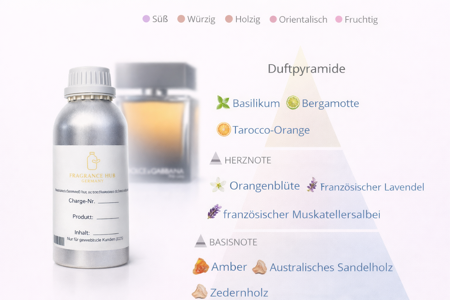 The One for Him perfume oil is ideally suited for creating oriental-woody men's fragrances. Its harmonious composition of fresh citrus and herbal notes, floral accents, and a warm woody base offers diverse application possibilities in your product development.