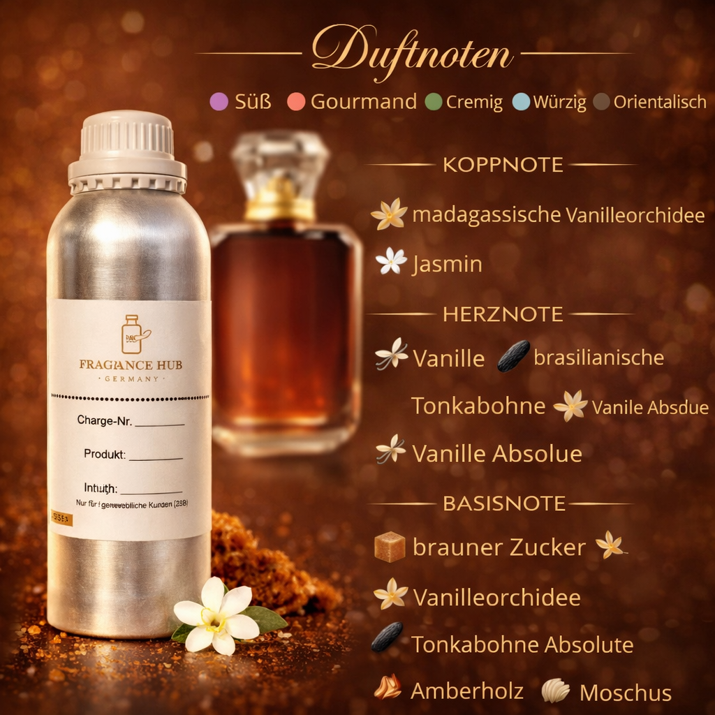 Ideal for private label, perfume manufacturing, scented candles, body care products, and high-quality room fragrances. Especially suitable for brands that want to offer luxurious vanilla compositions with a strong gourmand focus.