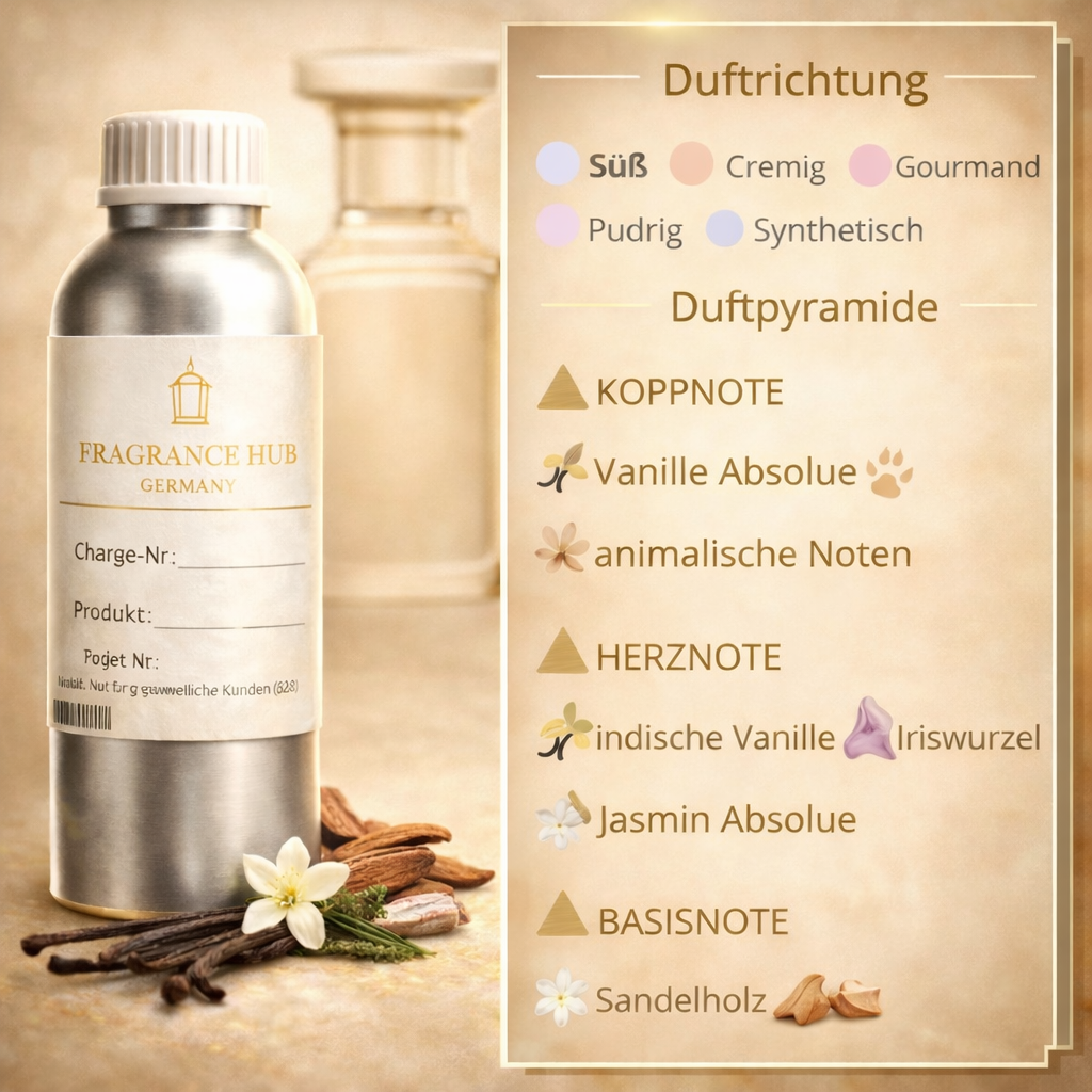 Use this perfume oil as the heart or elegant base note of your fragrance. The highly concentrated premium formula allows for precise dosing – even small amounts deliver an intense, long-lasting, and luxurious fragrance. The complexity of its six-layer vanilla composition makes it an indispensable premium ingredient for sophisticated fragrance creations.