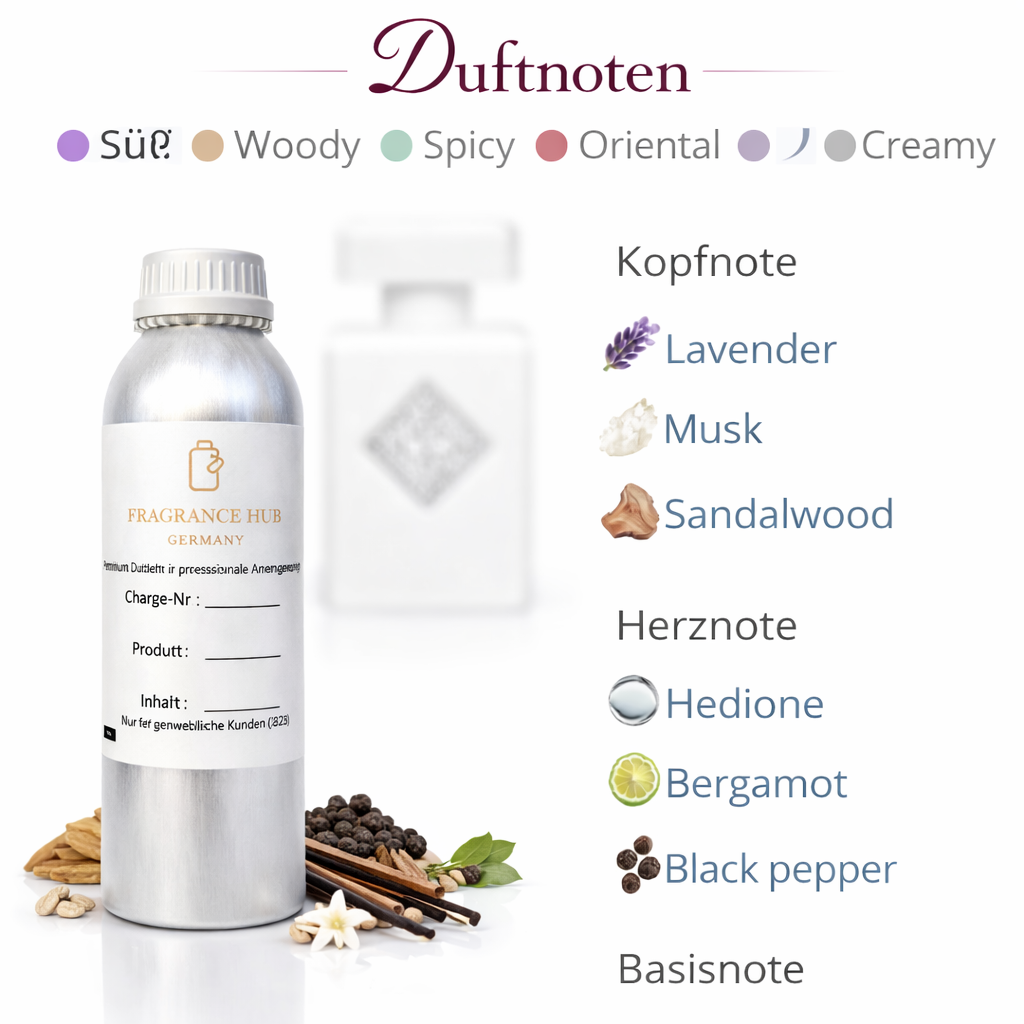 Silent Aur fragrance oil captivates with its long-lasting scent intensity and unique character. It lends your perfumes an elegant and seductive touch that will delight your customers. The high-quality ingredients ensure optimal fragrance development and pleasant diffusion.