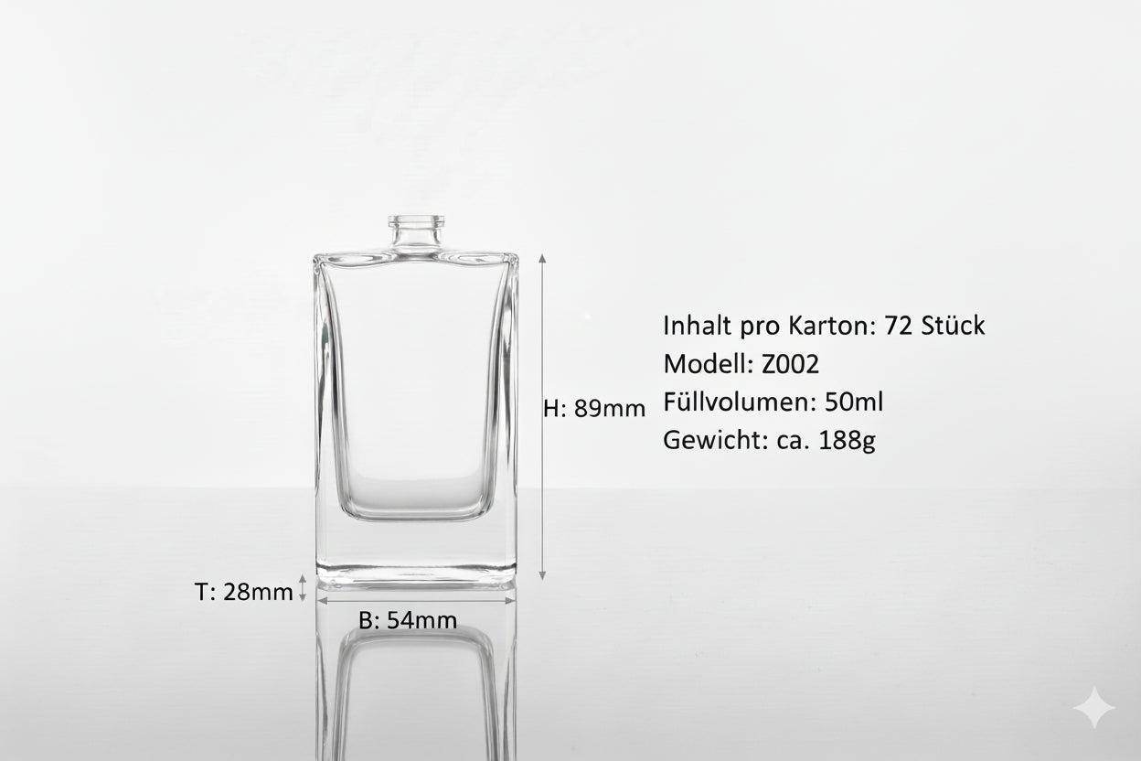 High-quality, square 50 ml perfume bottle made of clear glass with a gold-decorated crimp closure.