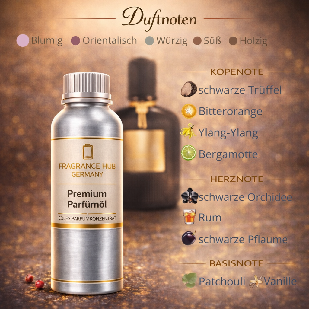 Black Orchidee ist ein opulentes, tiefes und sinnliches Duftöl mit stark orientalisch-floralem Charakter. Die Komposition vereint dunkle, geheimnisvolle Noten mit fruchtiger Süße und einer warmen, cremigen Basis. Der Duft wirkt luxuriös, ausdrucksstark und markant – ideal für anspruchsvolle Duftkonzepte und exklusive Markenpositionierungen.