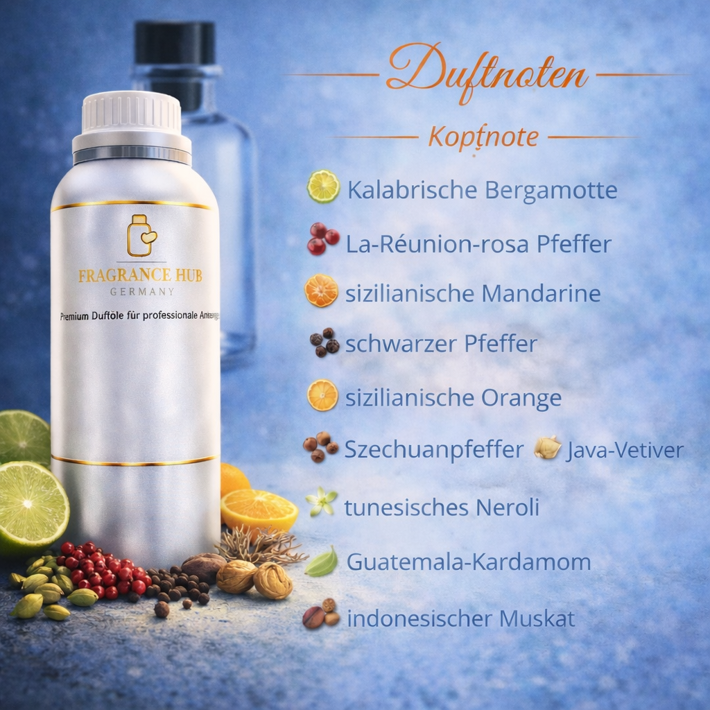 Eine meisterhafte Komposition aus erlesenen, geografisch spezifischen Rohstoffen, die eine einzigartige Duftreise erschaffen. Die Kombination aus frischen Zitrusnoten, würzigen Pfeffervariationen und erdigen Vetiver-Akzenten kreiert einen Duft von kosmischer Dimension.