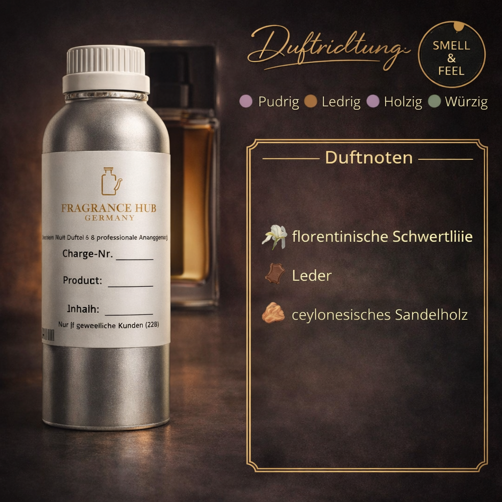 Unser exklusives Parfümöl überzeugt durch seine außergewöhnliche Duftintensität, bemerkenswerte Langlebigkeit und gleichbleibend höchste Qualität. Die Kombination aus florentinischer Schwertlilie, edlem Leder und ceylonischem Sandelholz schafft eine einzigartige Duftkomposition, die in der Parfümherstellung neue Maßstäbe setzt.