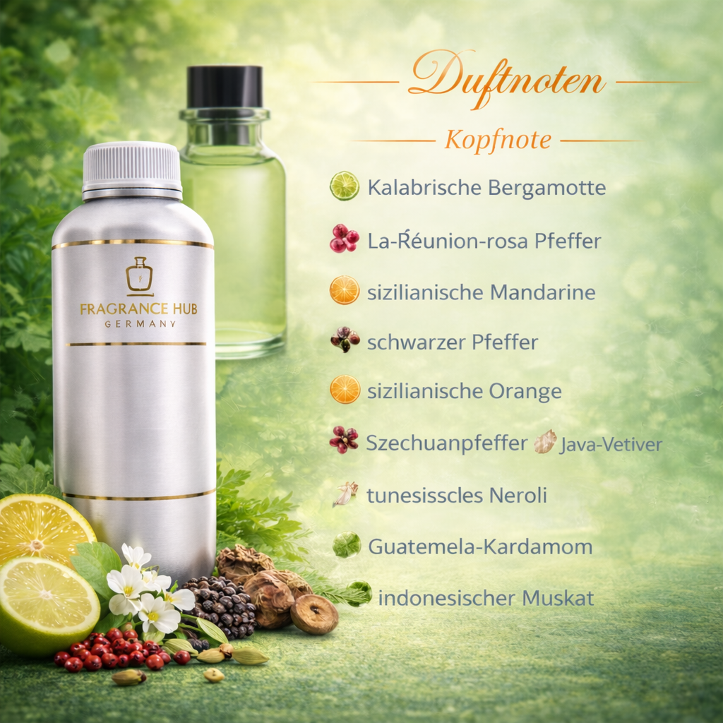 Kalabrische Zitronatzitrone • Gras • Perubalsam • Weißer Moschus • Kalabrische Bergamotte • Muskat • Rosa Pfeffer