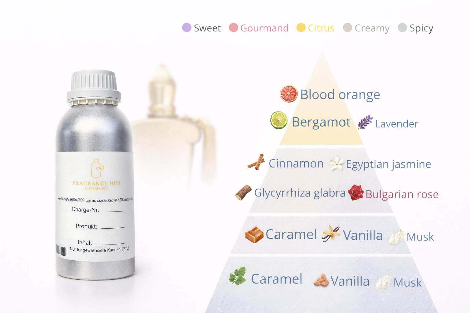 FHG Lirée ist ein hochwertiges Parfümöl in Standard-Qualität, das speziell für den Einsatz in der professionellen Parfümherstellung entwickelt wurde. Diese exklusive Gourmand-Komposition vereint frische Zitrusnoten, florale Eleganz und eine warme, süße Basis zu einem harmonischen Dufterlebnis.