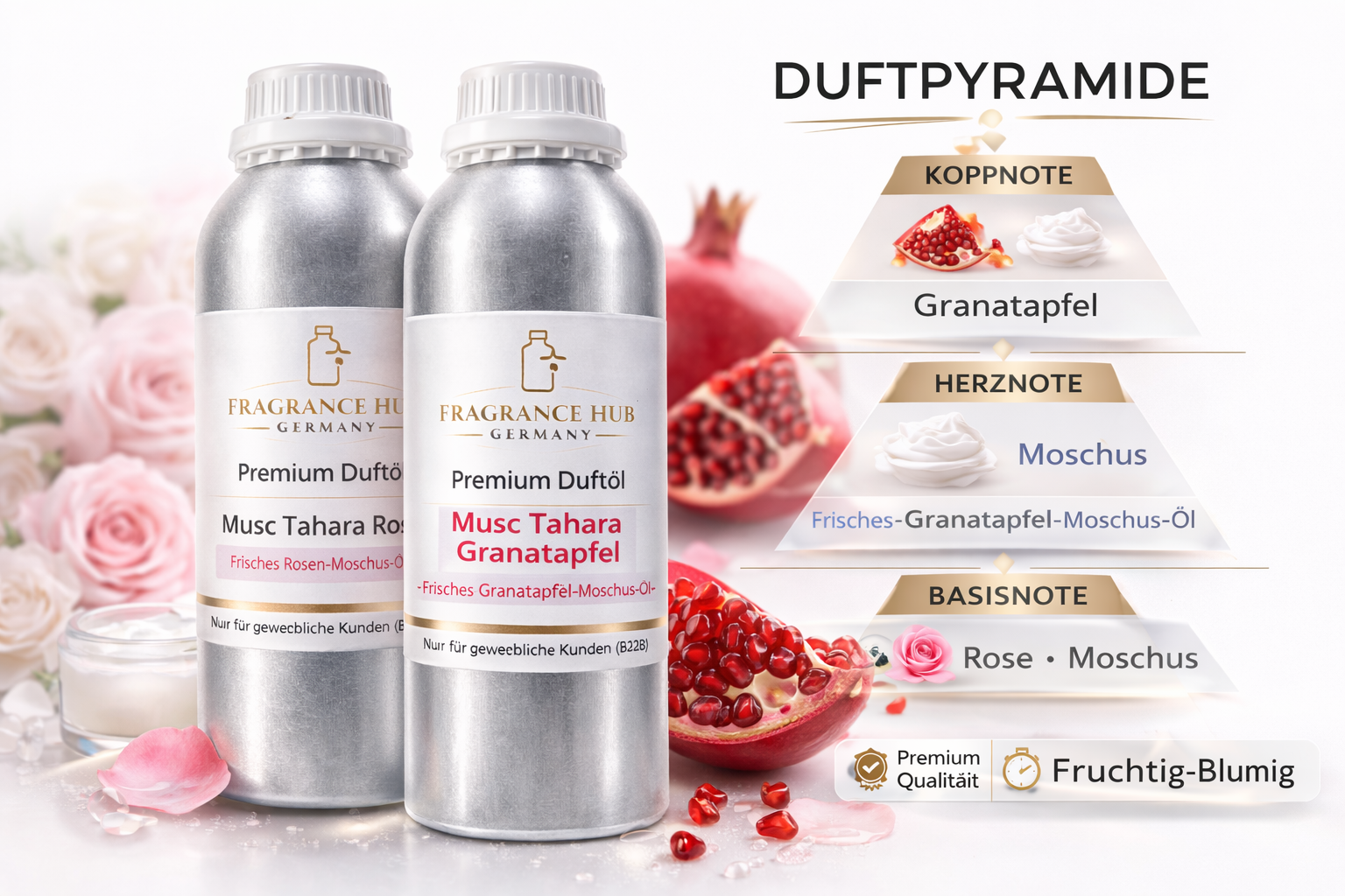 Anwendung für Parfumherstellung: Unser Granatapfel- Moschus Tahara Duftöl eignet sich perfekt für die Herstellung von exklusiven Parfums, Eau de Toilettes und Duftsprays. Es verleiht Ihren Produkten eine luxuriöse und verführerische Duftnote, die Ihre Kunden begeistern wird.