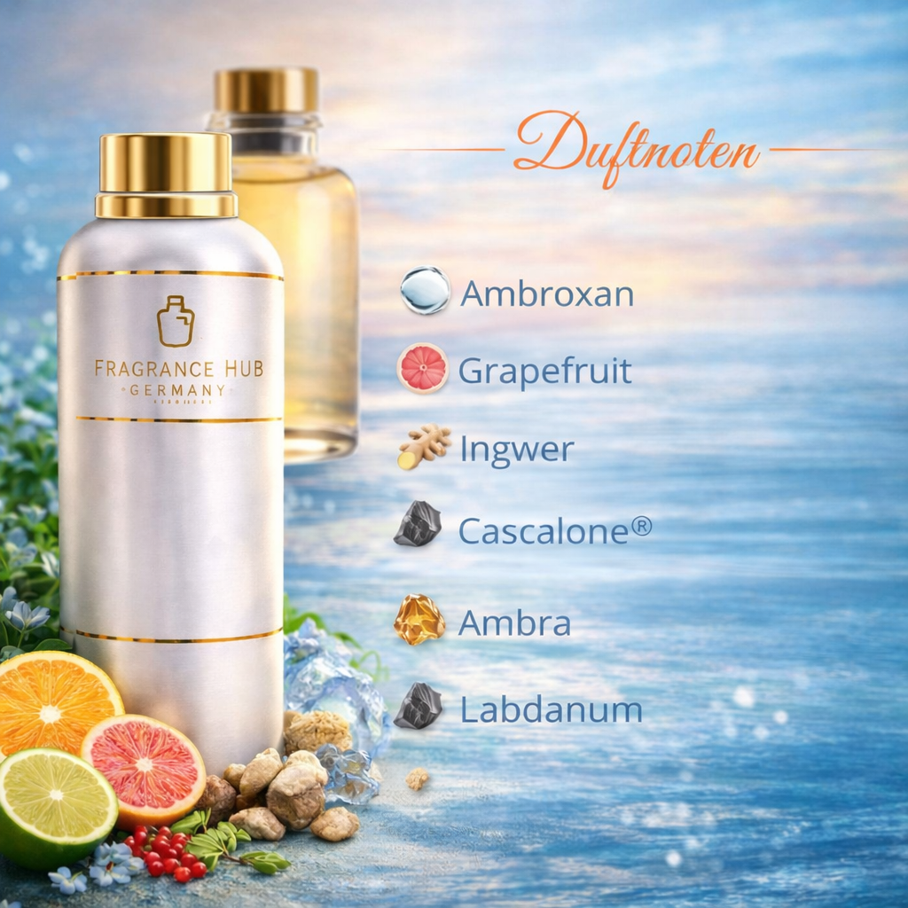 Eine moderne Komposition, die mit der spritzigen Frische von Grapefruit und der würzigen Note von Ingwer beginnt. Ambroxan und Cascalone® verleihen dem Duft eine maritime, aquatische Dimension, während Ambra und Labdanum für Wärme und Tiefe sorgen. Das Ergebnis ist ein zeitgemäßer Duft mit grenzenloser Ausstrahlung.