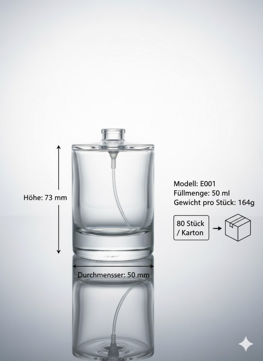 Schlichte und elegante 50 ml Parfümflasche aus klarem Glas mit hochwertigem Crimp-Verschluss.