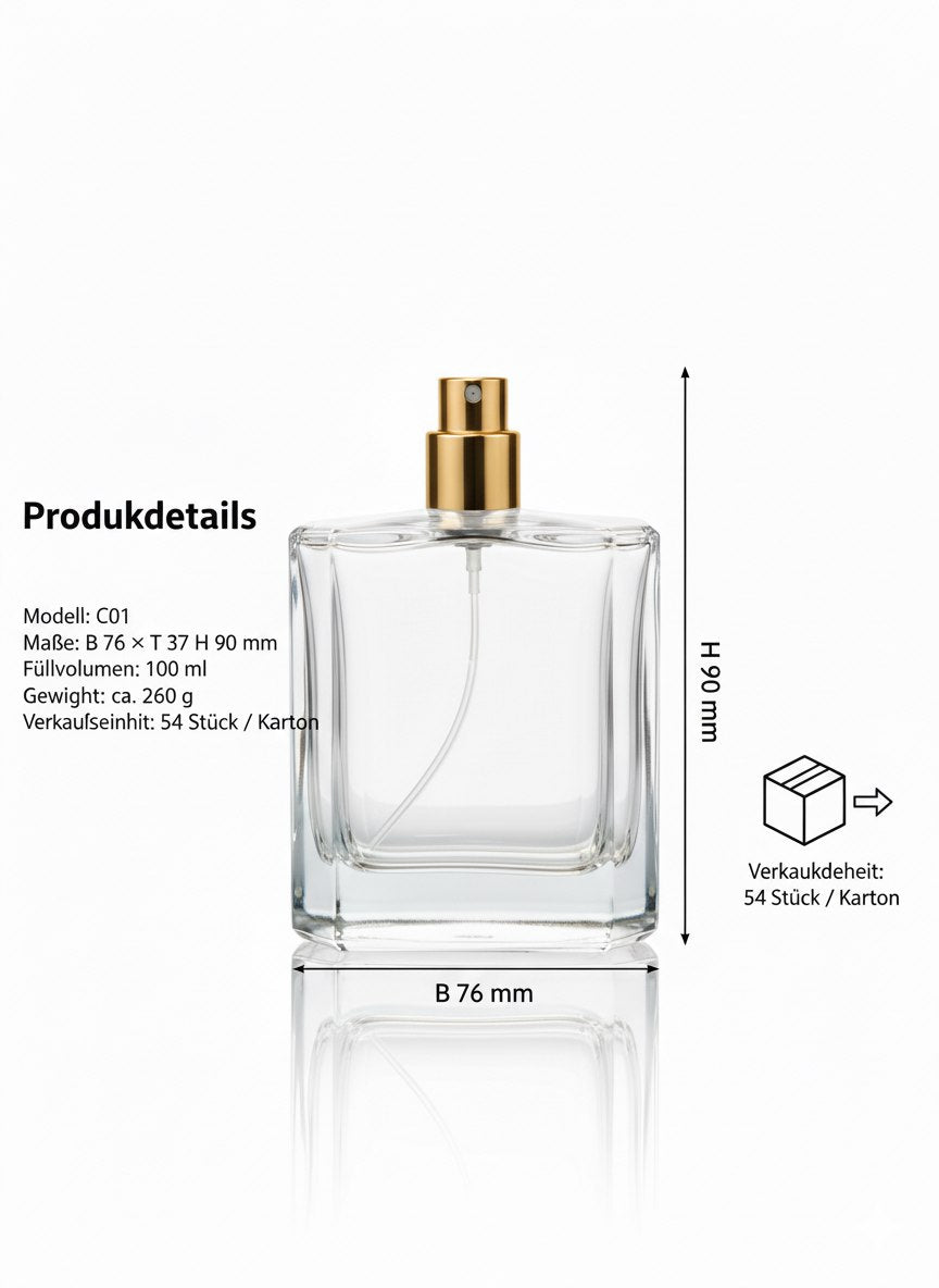 Elegante, quadratische 100 ml Parfümflasche mit sanft geschwungenen Seiten und goldverziertem Crimp-Verschluss.