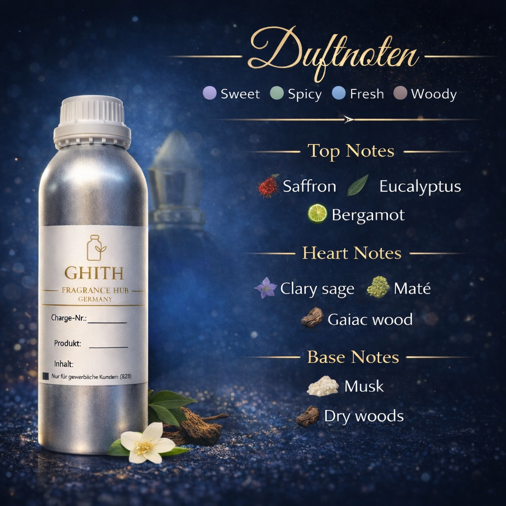 Die Kopfnote eröffnet mit einer frischen, leicht grünen Klarheit aus Bergamotte und Eukalyptus, veredelt durch die edle Würze von Safran. Im Herzen entfaltet sich eine aromatische Tiefe aus Mate und Muskatellersalbei, begleitet von rauchigem Guajakholz. Die Basis aus Moschus und trockenen Hölzern sorgt für eine elegante, langanhaltende Signatur mit maskuliner Raffinesse.