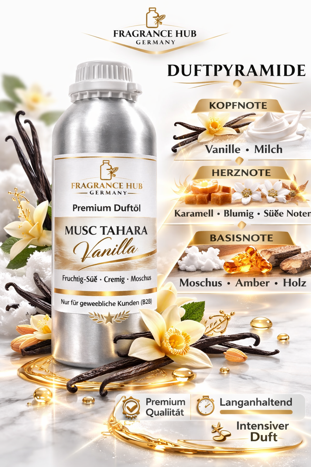 Das Vanille-Moschus Tahara Duftöl ist eine exotische und sinnliche Mischung, die perfekt für die Herstellung von hochwertigen Parfüms geeignet ist. Mit seiner einzigartigen Kombination aus süßer Vanille und verführerischem Moschus verleiht es jedem Parfüm eine luxuriöse und ansprechende Note.